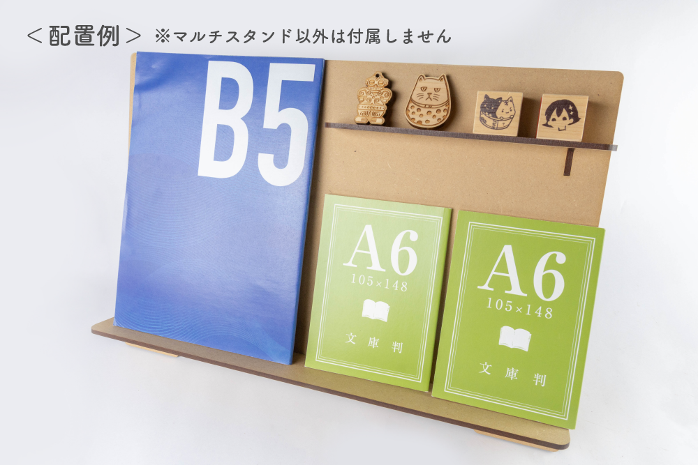 棚板を調整することで、A5判・A6判(文庫判)の組み合わせなら4〜6種類の本が並べられ、ポストカード、小物まで組み合わせは自由自在。