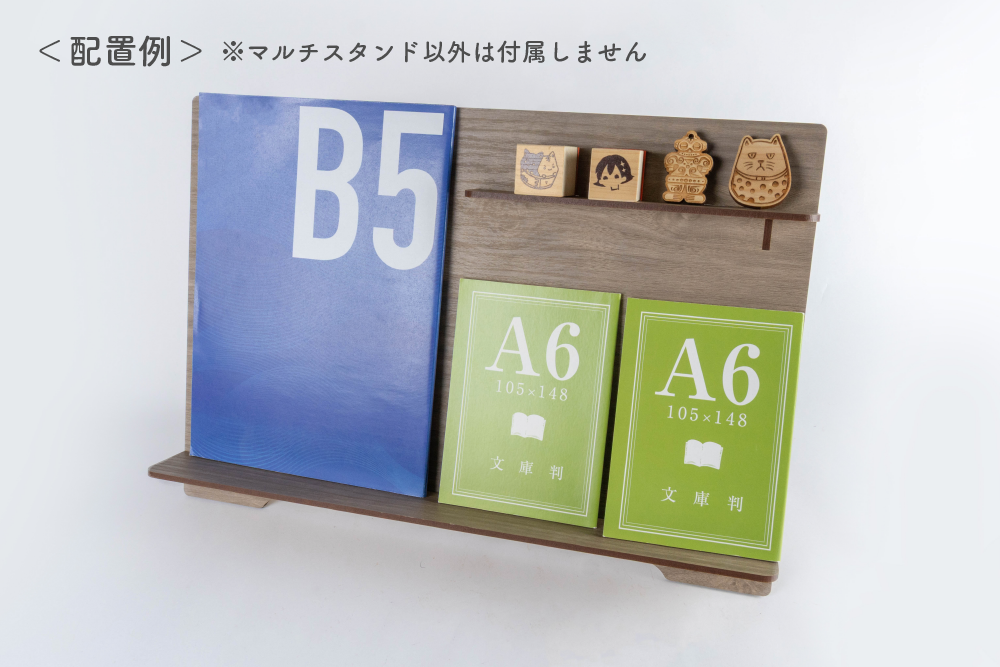棚板を調整することで、A5判・A6判(文庫判)の組み合わせなら4〜6種類の本が並べられ、ポストカード、小物まで組み合わせは自由自在。